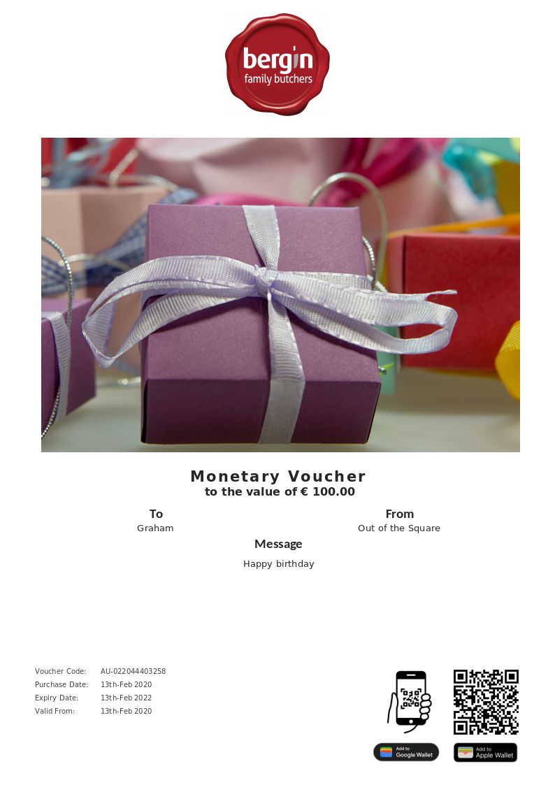 Bergin Family Butchers - Edenderry allows you to purchase instantly printable gift vouchers, special offers and tickets using the Voucher Connect platform.